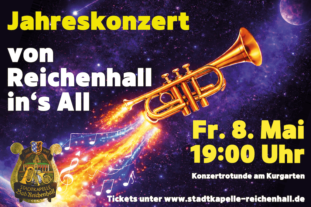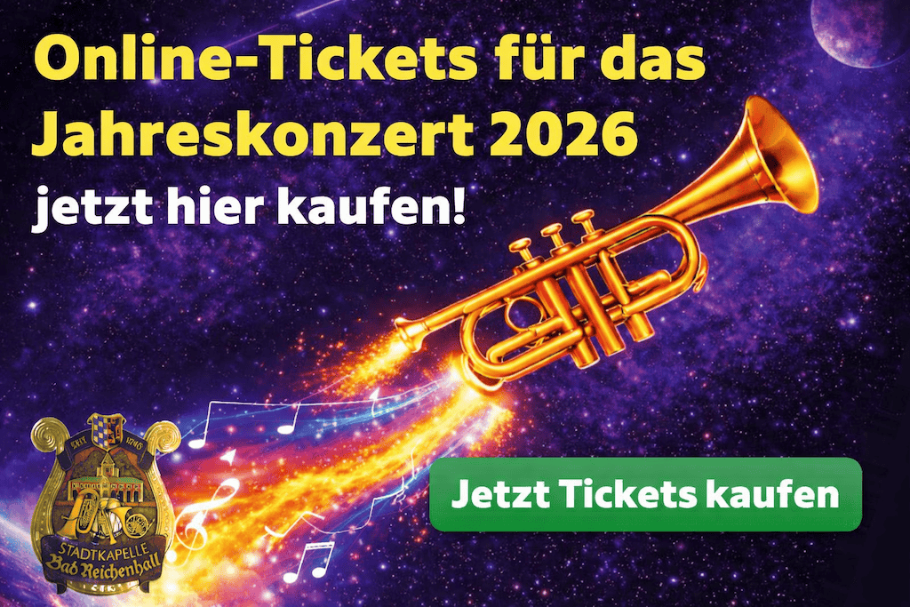 Sichern Sie sich jetzt bequem online Ihre Tickets für das Jahreskonzert 2026 der Stadtkapelle Bad Reichenhall. Unter dem Motto „Von Reichenhall in’s All“ erwartet Sie ein musikalischer Konzertabend voller klangvoller Höhepunkte.